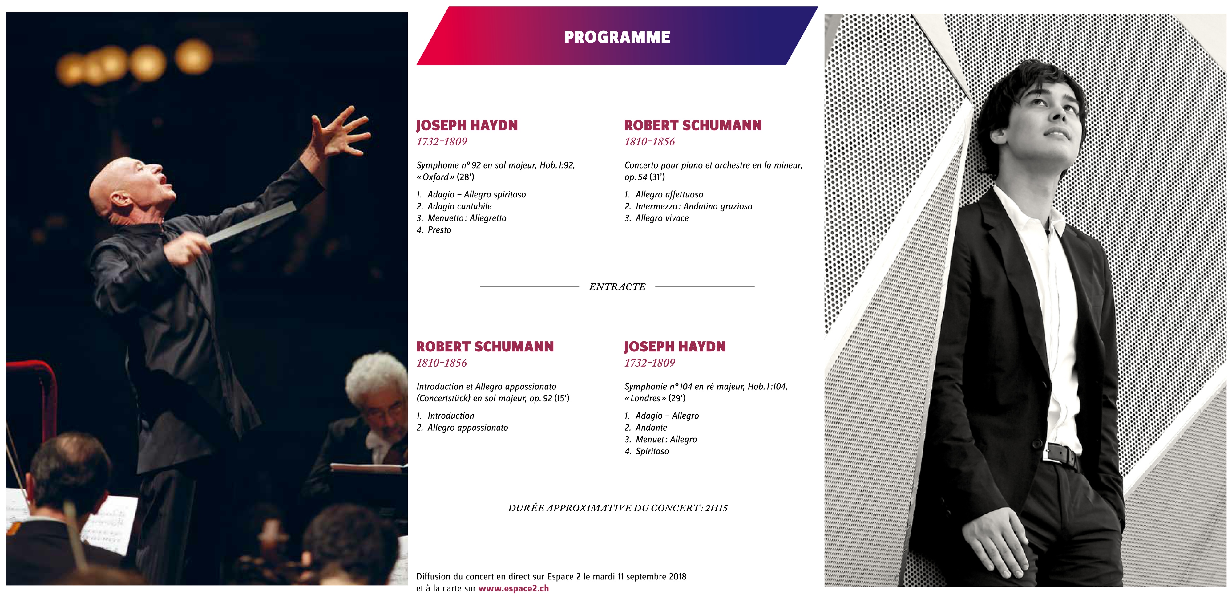 Symphonie No 92 en sol majeur "Oxford" de Joseph Haydn et Concerto pour piano et orchestre en la mineur, op. 54 de Robert Schumann (le concerto commence au minutage 26 minutes 11 secondes)
