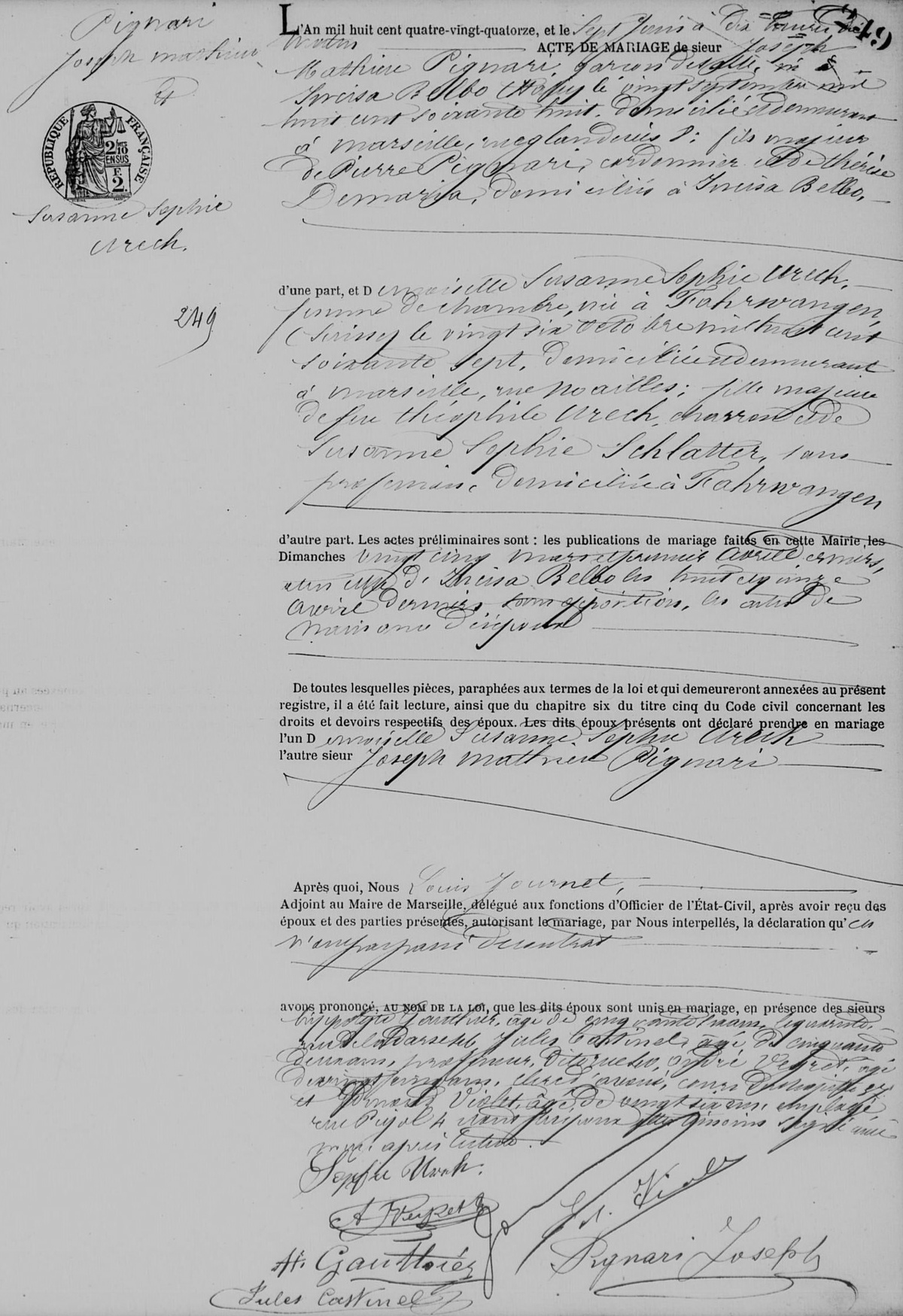 Acte de mariage des parents d'Hélène Pignari, copie reçue de Michel Contreau