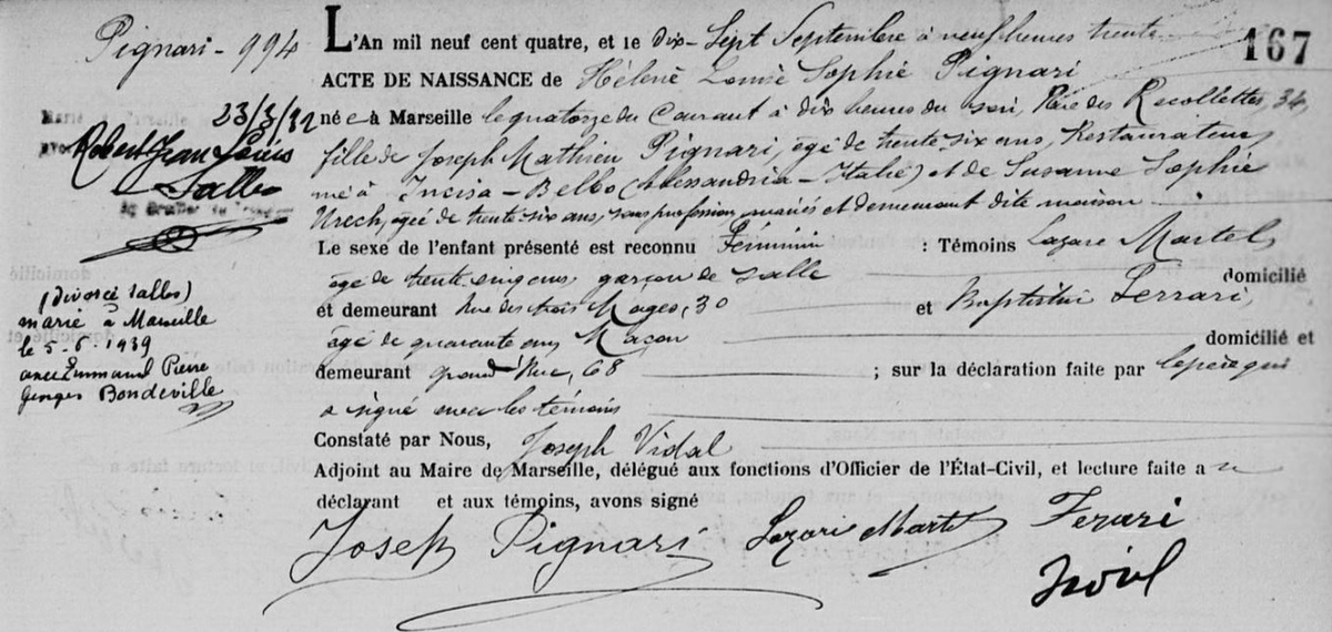 Acte de naissance d'Hélène PIGNARI, copie reçue de Michel Contreau